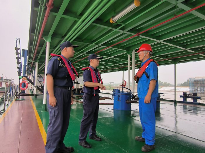 严格检查,详细排查风险隐患。7月14日,梅龙大队执法人员来到辖区加油站码头对到港油船“宁金航*”进行现场检查。执法人员对该船的相关证书、船员配备、消防救生设施、输油管路连接、船舶封闭处所作业及各项安全管理制度等情况进行了详细检查;任店大队执法人员前往任家墩水上加油站,对照《涉污作业单位防污染周期检查表》,重点检查了加油站安全管理制度的建立落实,隐患排查治理,智能监控系统平台的建设运行等情况,并仔细查看了加油站安全教育培训开展,应急演练开展及船舶生活垃圾、生活污水、含油污水的扫码交付记录等情况。