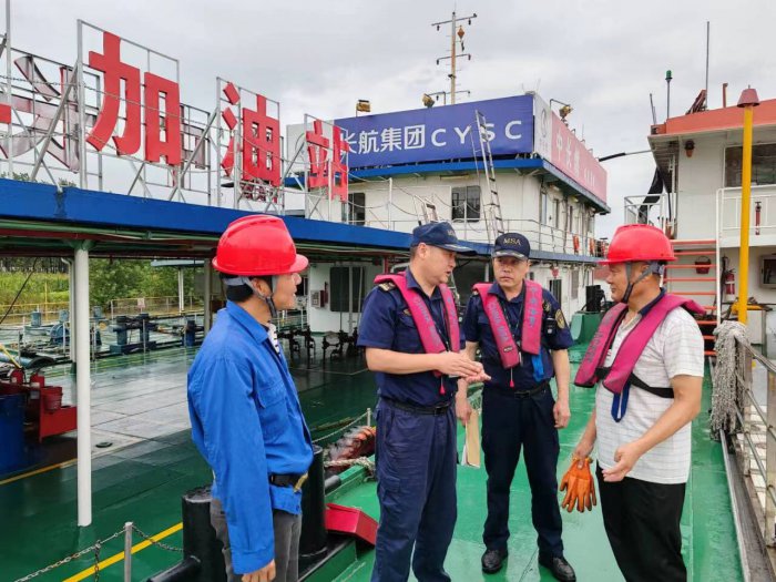强化宣传,提高船员安全意识。7月12日,扫帚沟大队执法人员前往谭家沟加油站开展现场安全宣传工作。执法人员首先向加油站负责人传达了《长江海事局关于进一步加强高温汛期危险品船舶安全监管的通知》文件精神,提醒加油站落实安全生产主体责任,重点督促船舶装卸油时严格遵守安全与防污染操作规程,全力保障船舶载运危险货物安全。最后,执法人员提醒加油站工作人员加强封闭处所作业安全监管,加强对船舶封闭处所作业所需的测氧仪、隔绝式呼吸器、防爆手电筒、防爆对讲机等设备器材以及封闭处所作业记录的检查。