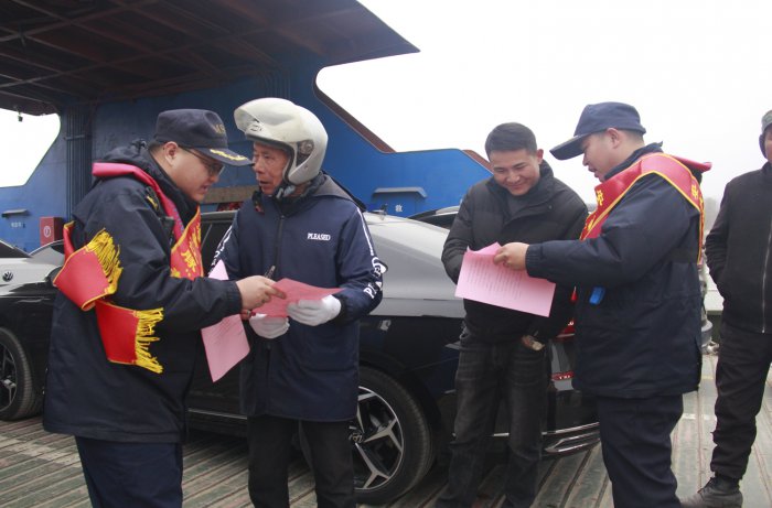 送“信”入渡口。在渡口,执法人员对新建的“皖枞阳车渡***”开展了上线前船舶安检,重点检查了渡船消防救生设备驾驶台助航仪器性能以及机舱主机、舵设备状况。对于检查中存在的缺陷,执法人员要求渡船船员按规定积极整改,杜绝渡船“带病”航行。在城区九号码头,安庆海事局“江豚”志愿者热情洋溢地为返乡旅客提供问询指引、行李搬运、秩序维护等便民服务,并通过向船员、旅客发放《致返乡旅客及船员朋友一封信》的形式,开展了渡口水上安全知识宣讲,引导船员、旅客树立安全驾驶、平安出行理念。