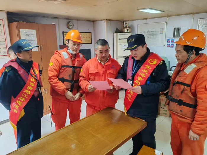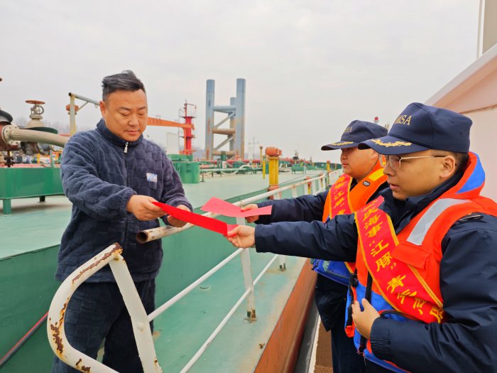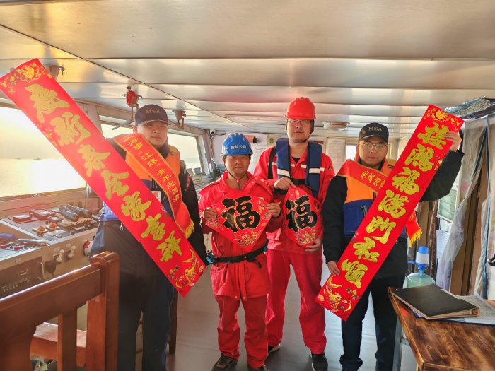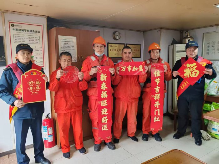 送“春联”进锚地。在五里庙锚地,港区海事处“江豚”志愿者为返乡船民送去新春祝福和温暖,青年志愿者们带着精心准备的春联、窗花、福字等新年祝福来到船头,传递春节辞旧迎新、阖家团圆、国泰民安的文化内涵,让船员们真切感受到海事“温度”。
