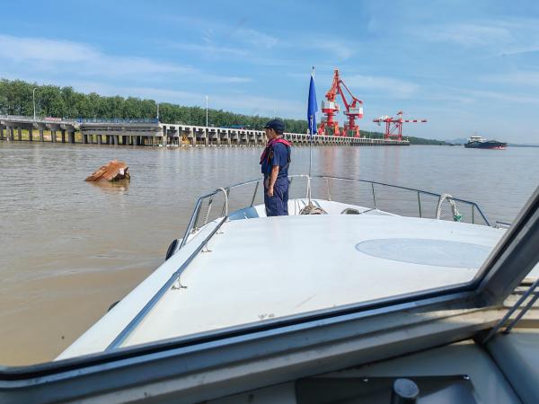 服务有温度,确保船舶安全航行。执法的刚性之外,更有服务的柔性。东流处执法人员深知,执法不是“管卡压”,而是通过优化服务让船员更放心。近日,有船员反映在吉阳矶附近水域有一个巨大的不明物体在湍急的江水中起伏,严重威胁过往船只航行安全。接到指令后,双河大队执法人员立即出动海巡艇赶赴现场。由于江水水流复杂,航标体积庞大且重心不稳,打捞工作困难重重。经过四个小时的紧张作业,在海事与航道部门的密切配合下,废旧航标终于被成功固定,并拖离主航道,转移至安全区域。