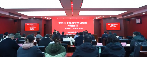 12月18日上午,“党旗红”机关宣讲团走进安庆市民政局,开展党的二十届四中全会精神机关示范宣讲。市民政局党组书记江学文,党组副书记、市老龄委主任王征兵出席报告会,市、区民政系统党务干部30余人参加。